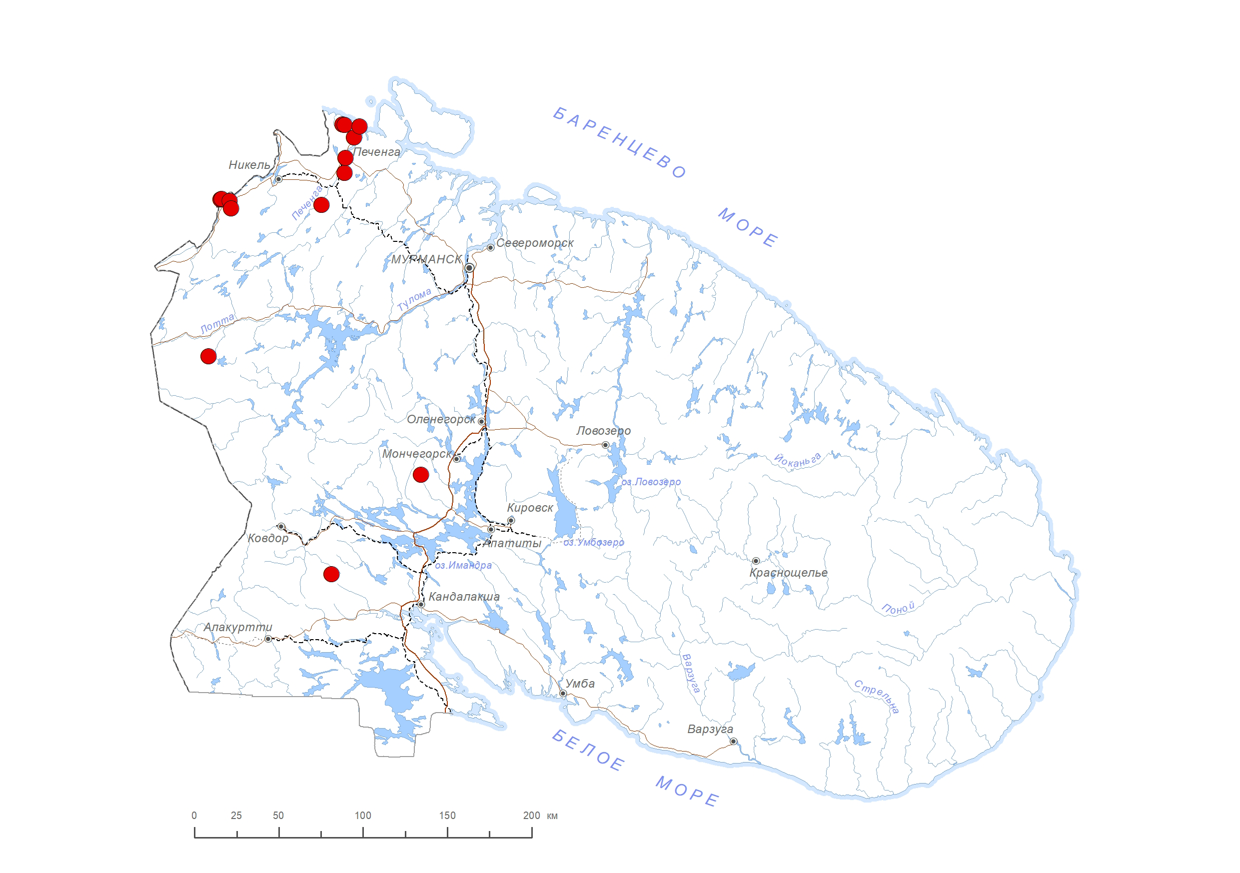 Представлен на территории заповедников Лапландского и «Пасвик», природного парка «Кораблекк», заказника «Кайта». Необходима организация специальных работ для поиска исторических местонахождений, изучения состояния популяций и оценки угроз их существованию.