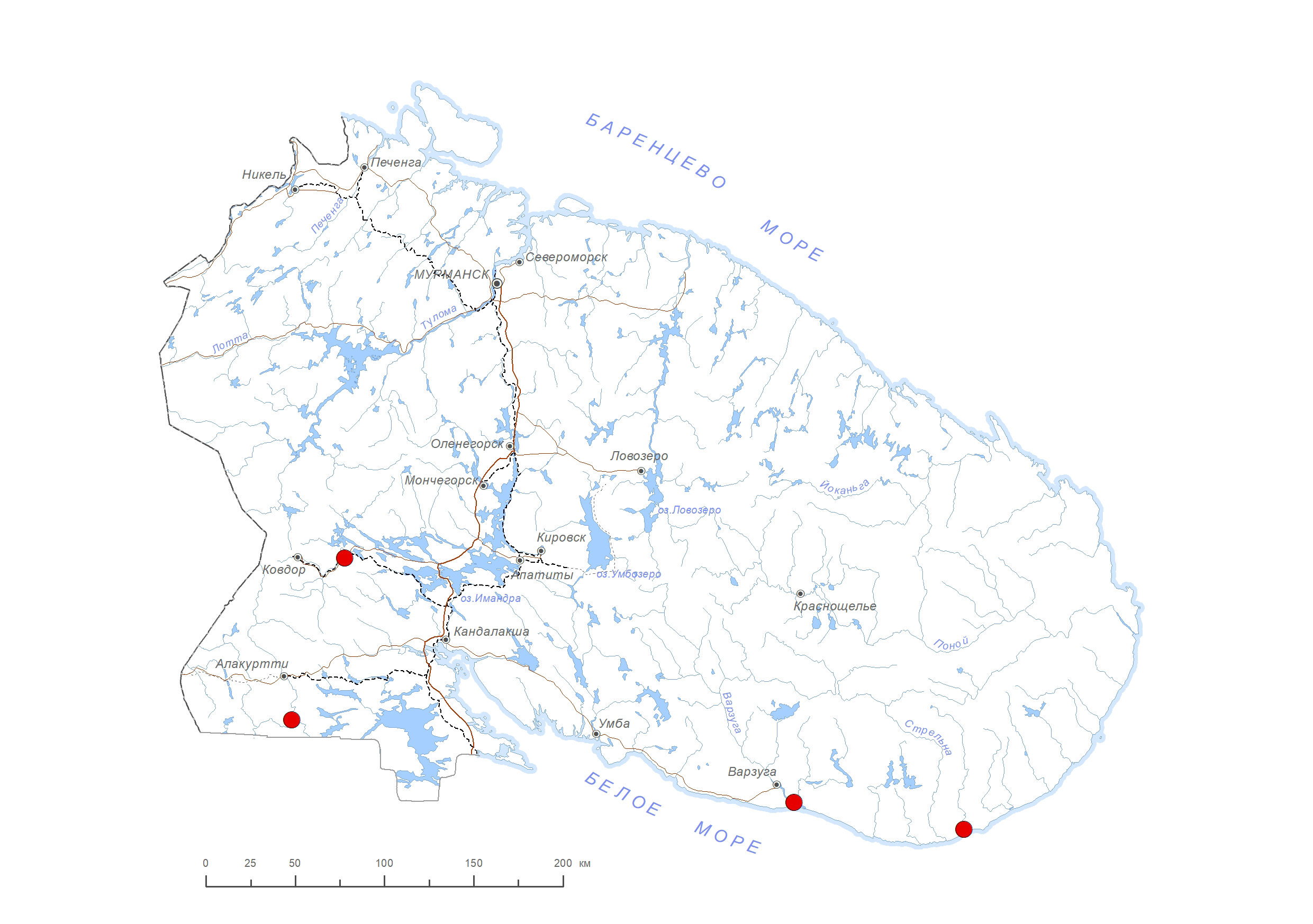 В Мурманской обл.: р. Ена [1, 2], окр. с. Чапома [1–3], нижнее течение р. Варзуги – о. Вичанная Курья [1, 4] и нижнее течение р. Кутсайоки [2, 5]. Для окр. с. Тетрино [6] приводился ошибочно [1] на основе неверной интерпретации местонахождения [3]. В России: европейская часть, Сибирь, Дальний Восток. Вне России: север Европы, Азия. Бореальный евразиатский вид [7].