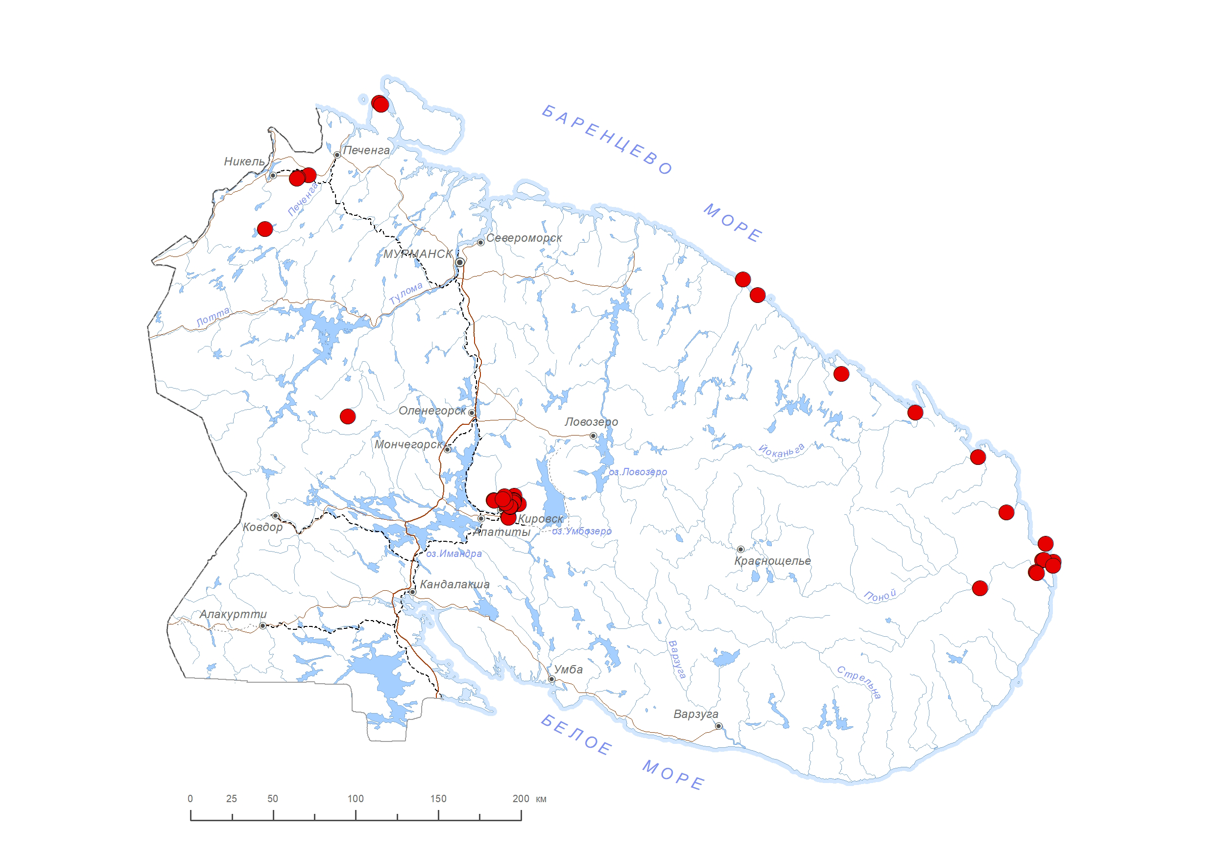 В Мурманской обл.: п-ов Средний – губа Б. Волоковая, г. Кивиайдантунтури [1–3], Мустакаллио [1, 2], Печенгские тундры – горы Пильгуявр [4], Райсоайви [2], Вильгискоддеоайви [2], Киедгъявр [2, 4], о. Харлов [5], Семиостровское побережье между Вояткой и Вост. Лицей [6], губа Ивановская [3, 7], р. Травяная [2], р. Русинга [2, 8–10], ур. Три Острова [5, 8, 10, 11], устье р. Поной [1, 2, 8, 9, 11], Сальные тундры [12], Хибины [2, 3, 5, 6, 8, 11, 13, 14]. В России: европейская часть, Сибирь, Дальний Восток. Вне России: север Европы, Сев. Америка [15].