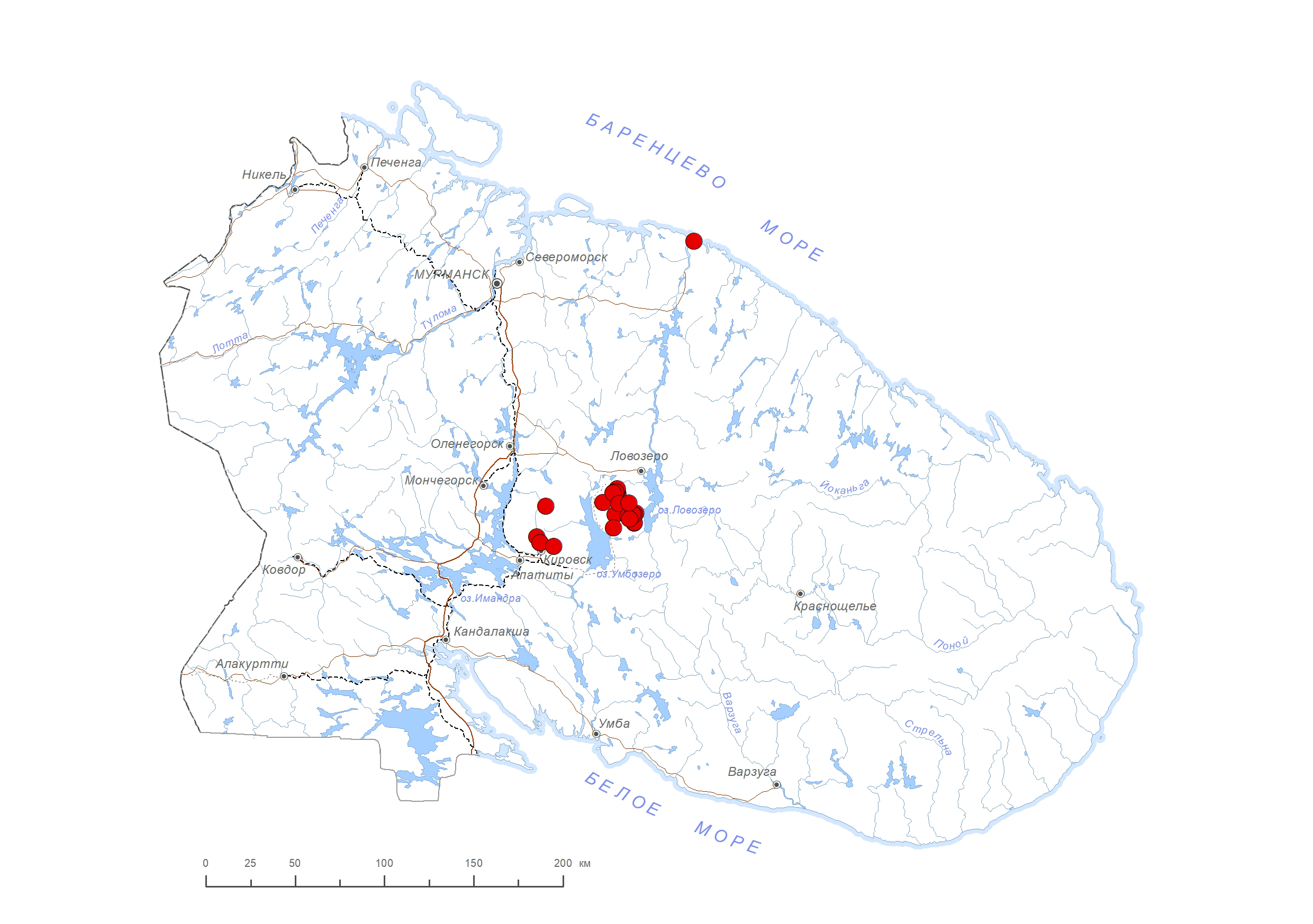 В Мурманской обл.: Ловозерские горы (часто), Хибины (очень редко), нижнее течение р. Вороньей [1, 2]. Эндемик Фенноскандии. В России: только Мурманская обл. Вне России: северная Норвегия [3].