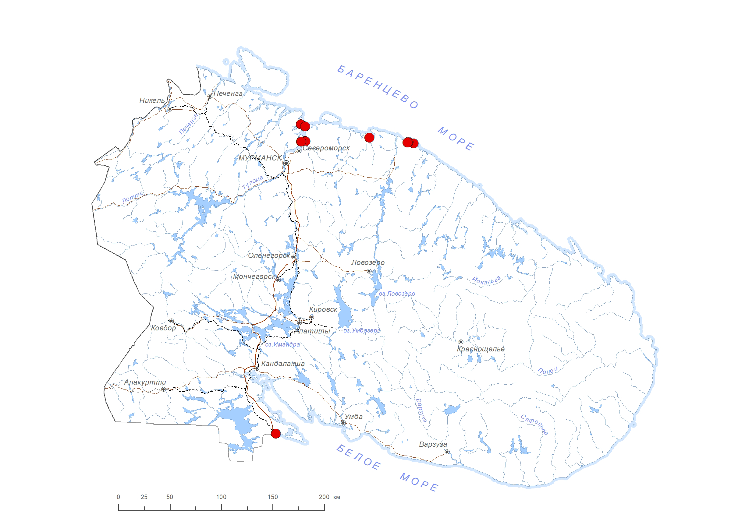 В Мурманской обл.: Баренцево море: Кольский залив [1], губы Териберская, Зеленецкая, Шельпинская [2], Ярнышная [3]; Белое море: Кандалакшский залив, губа Ругозерская [4, 5]. В России: Баренцево море, арх. Новая Земля, пролив Маточкин Шар [4], арх. Земля Франца-Иосифа [6]; Белое море: окр. Беломорской биологической станции МГУ [4]; Берингово море: п-ов Камчатка, Карагинский залив [7], Командорские острова [8]; Японское море: залив Восток [9], залив Петра Великого [10]. За пределами России: арх. Шпицберген, побережье Норвегии, Германии, Франции, восточная Гренландия, Канадский Арктический архипелаг, побережье Северной Атлантики, тихоокеанское побережье Северной Америки [11].