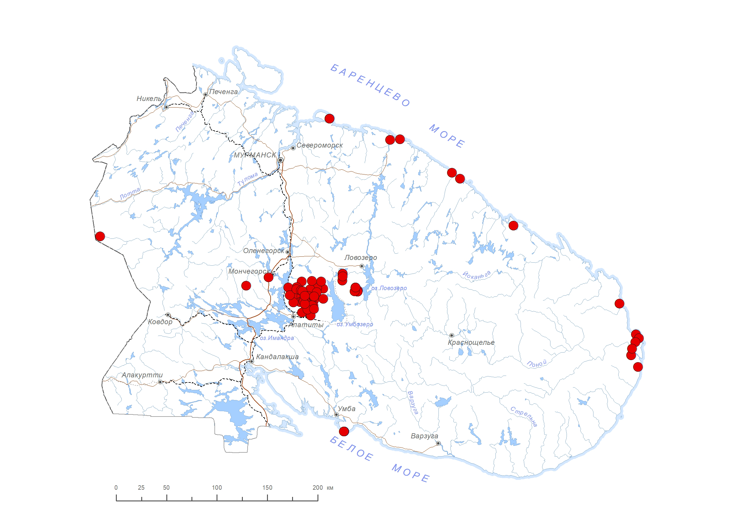 В Мурманской обл.: окр. пос. Никель [1] и Печенгские тундры [2], о. Кильдин [1], Семиостровское побережье [3], окр. ст. Гаврилова [4], р. Нота – гора Падос-тундра [2, 4], Мончетундра [1], Чуна-тундра, Сальная тундра [5], гора Ниттис [6], Ловозерские горы [1, 7], Хибины [1, 2, 4, 8], губа Панфилова [2], р. Русинга [2, 4], Турий мыс [1, 3, 6, 9], долина р. Кутсайоки – близ оз. Риекинлампи [9]. В России: север европейской части. Вне России: Скандинавия, Сев. Америка (Гренландия) [10]. Арктический амфиатлантический вид.