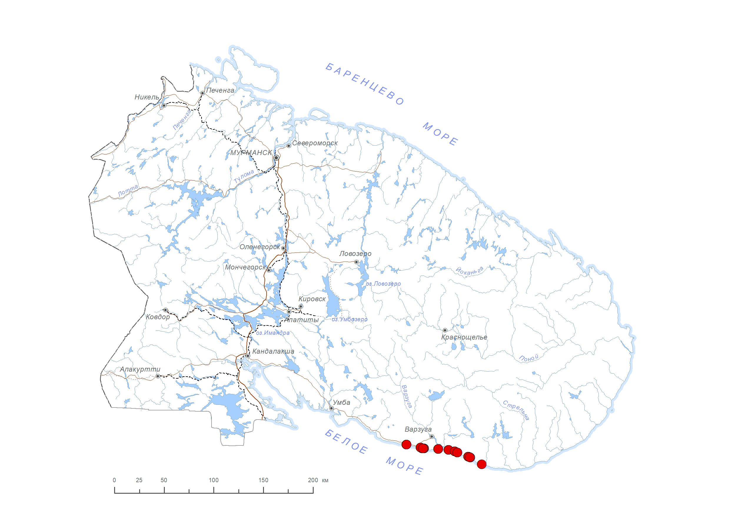 В Мурманской обл.: с. Кашкаранцы [1–4], мыс Корабль [2, 3, 5, 6], побережье от устья р. Варзуги до р. Чаваньга [1–5]. Как случайный занос отмечена на 50 км автодороги Умба – Варзуга [1, 2]. В России: север европейской части. Вне России: север Европы [7]. Бореальный европейский вид, в области на северной границе ареала.