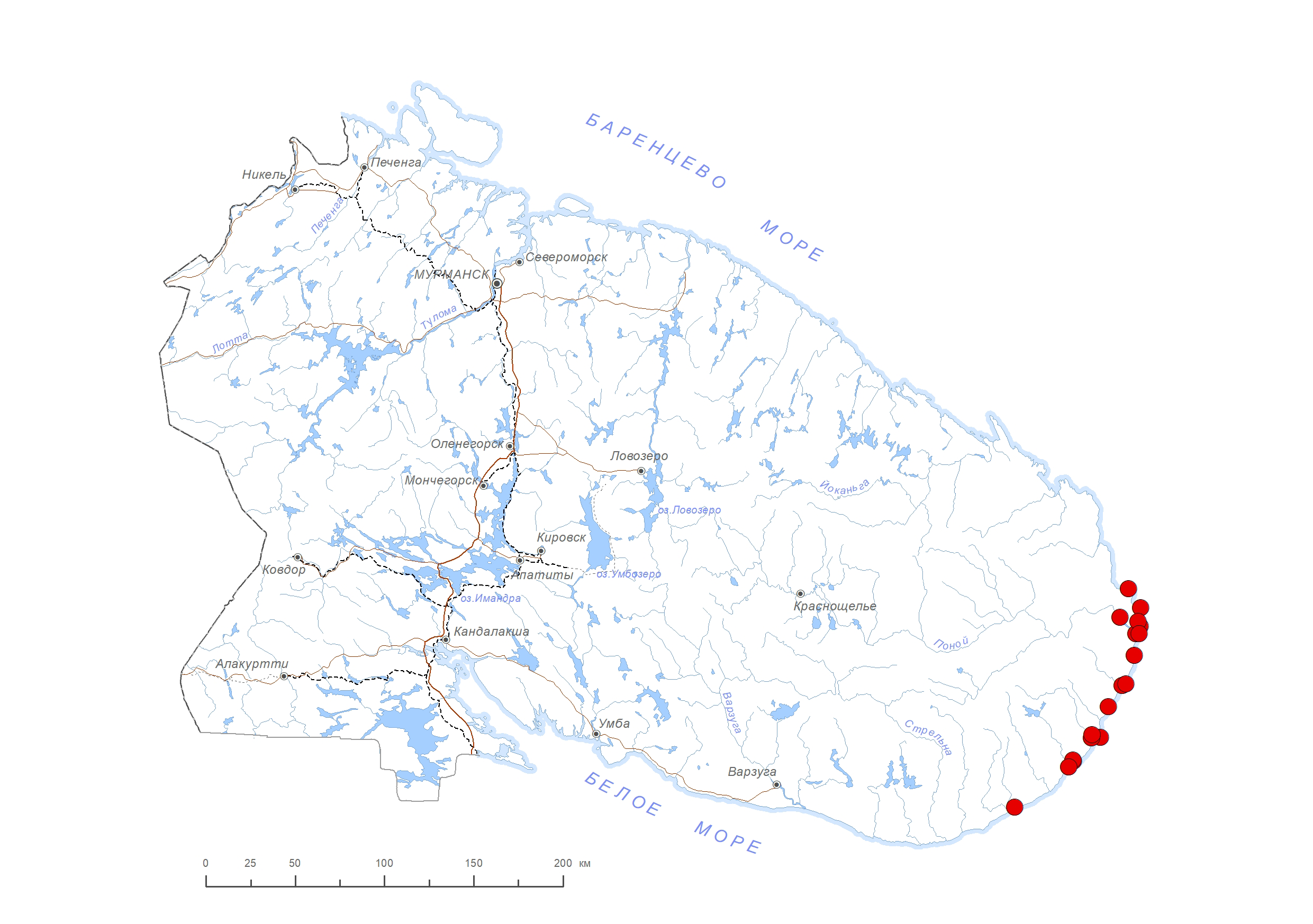 В Мурманской обл.: побережье и острова между м. Орлов и устьем р. Поной [1–5], м. Кузьмин [2, 6], губа Даниловская и о. Данилов [1, 5], губа Красные Щелья [1, 5, 6], с. Сосновка и о. Сосновец [1, 2, 7], губы Большая Бабья и Песчаная [1], окр. с. Пялица [1, 5]. В середине XIX века приводилась для окр. г. Колы [8]. В России: европейская часть, Сибирь, Дальний Восток. Вне России: Европа, Азия, Сев. Америка [9]. Гипоарктический голарктический вид.