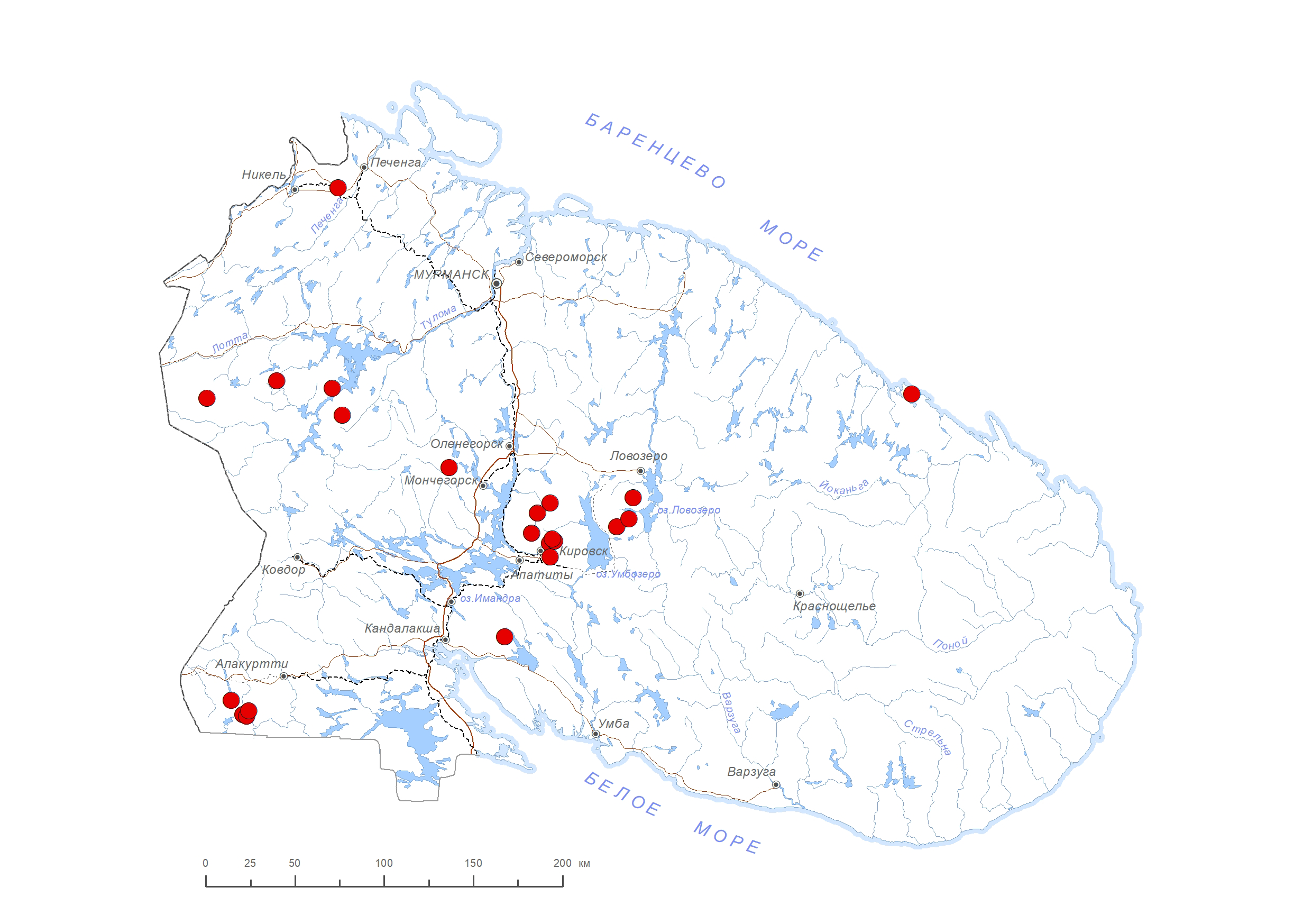 В Мурманской обл.: вост. побережье губы Ивановской (Баренцево море) [1, 2], массив Ионн-Ньюгоайв – г. Каусенпя [3], Лавна-тундра [4], г. Курбашпакхи [5, 6], г. Чильтальд [5, 7], Монче-тундра – оз. Вайкис [8], Хибины – горы Лявочорр [3, 9], Рисчорр [7], Тахтарвумчорр [10], Юкспорр [3, 10], пер. Юкспорлак [6, 7, 11], Айкуайвенчорр [3, 11]; Ловозерские горы – р. Индичйок и окр. оз. Пальга [3, 12]; Иолги-тундры [3, 13], басс. оз. Апаярви – ущ. Туорсукуру [7, 14], долина р. Кутсайоки – ущелья Курсукуру, Рускеакуру, Пюхякуру и скалы Хирвиакалио [7, 14]. Популяция на г. Вуоггоайви (Онкитунтури) [7, 15], вероятно, погибла. В России: Мурманская и Архангельская обл. – изолированно в басс. р. Кулой [9, 16]. Вне России: Европа (Скандинавия) [17]. Эндемик сев. Фенноскандии.
