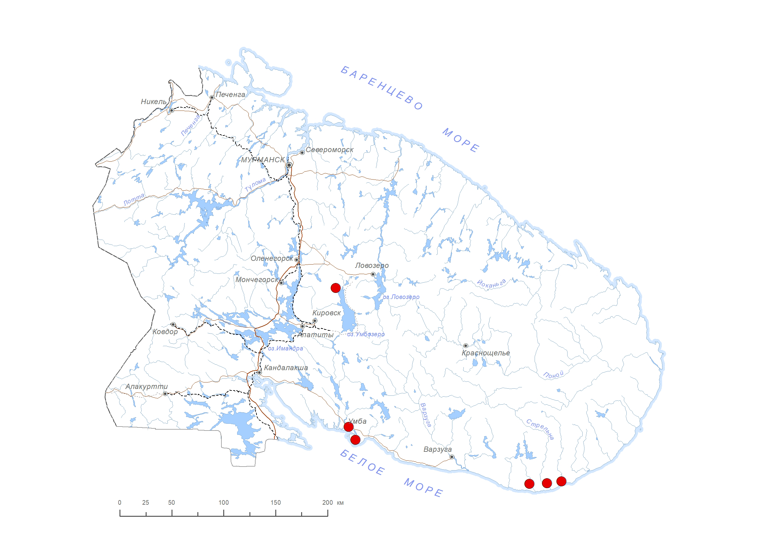 В Мурманской обл.: северный берег оз. Умбозеро [1, 2], окр. пос. Умба [3, 4], Турий мыс [5], окр. сел Чапома [3], Тетрино, Стрельна [3]. В России: описан как эндемик Кольского полуострова [6]; позднее к этому виду отнесены также популяции с севера европейской части и Урала [7]. Вне России: не встречается.
