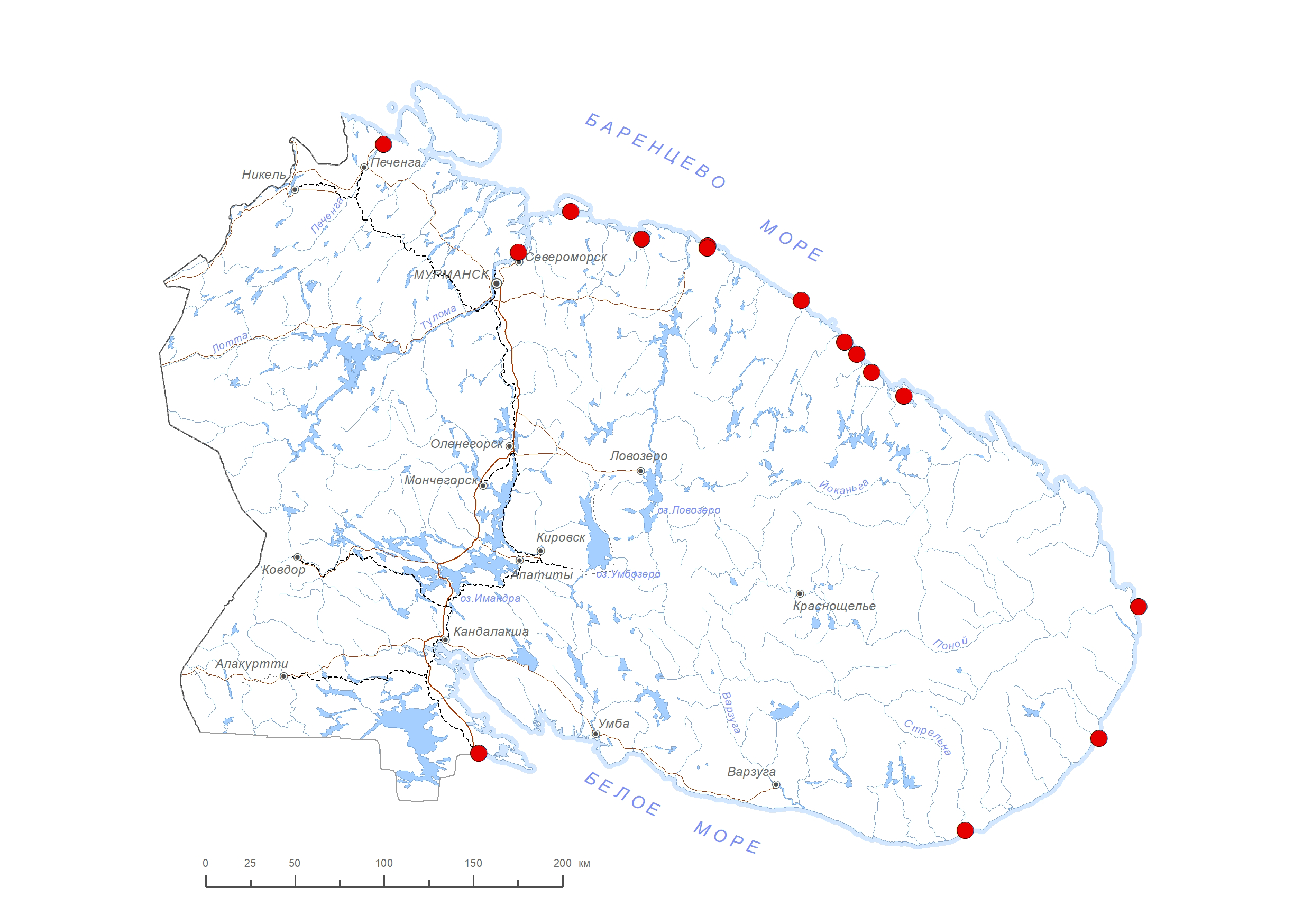 В Мурманской области: Баренцево море: Печенгская губа [1, 2], Кольский залив [3–5], о. Кильдин [1], арх. Семь островов [6], губы Териберка [2], Зеленецкая [1, 2], Ярнышная [1], Мертвецкая, Ивановка, Дворовая [2]; Белое море: о-в Сосновец, губа Чапома, арх. Три острова [6], Кандалакшский залив, губа Ругозерская [7–9]. В России: Баренцево море: о. Колгуев [6, 10], Новая Земля [11, 12]; Белое море: о-в Жижгин [11]. За пределами России: Норвегия, Шпицберген [13, 14], Исландия, Гренландия, Северная Америка [15].