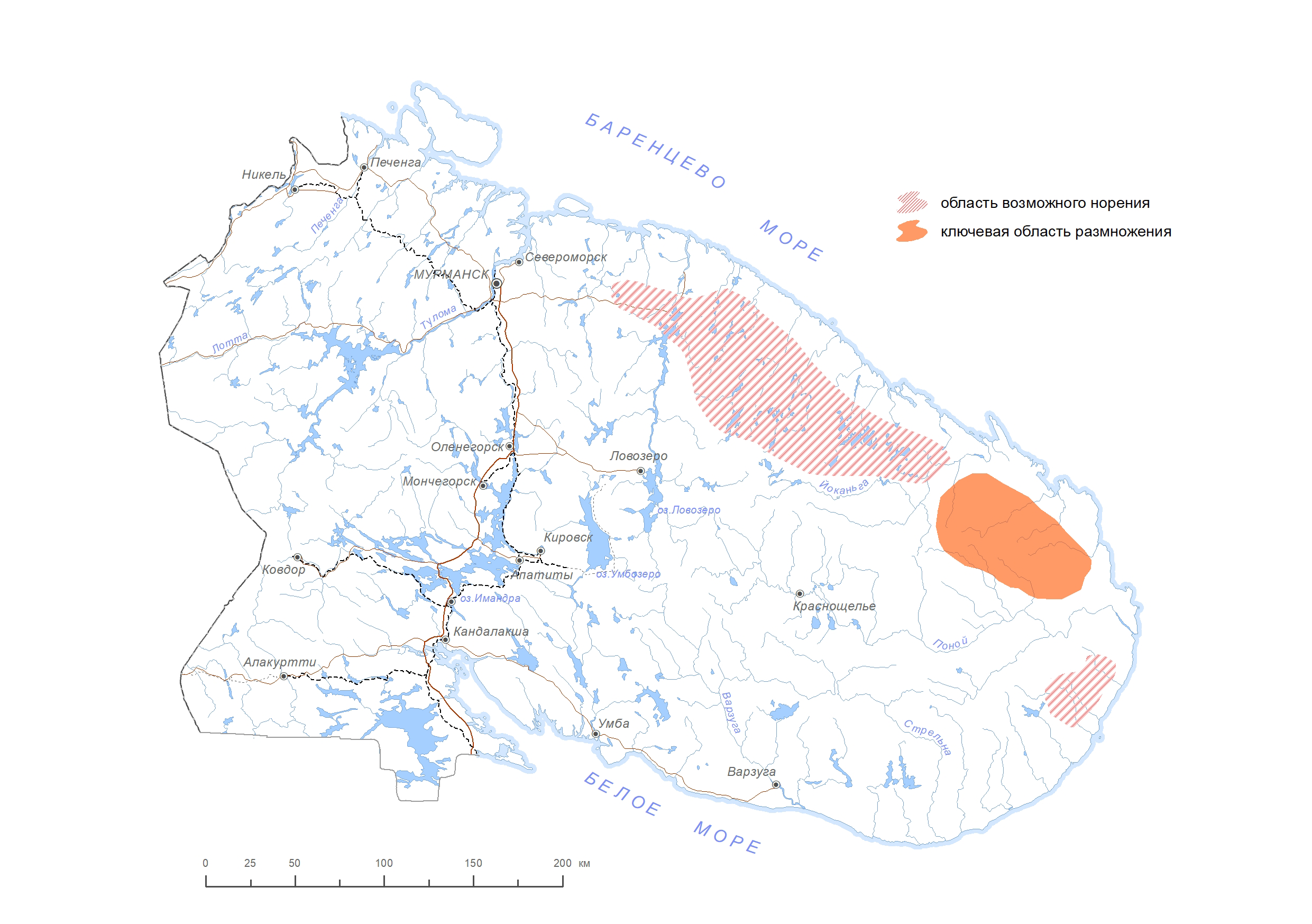 Циркумполярный вид, распространен, главным образом, в арктических, типичных и горных тундрах материковой Евразии от Скандинавского п-ова и далее на восток до м. Челюскина. Ранее к местам постоянного обитания вида относили весь Мурманский берег Баренцева и Белого морей и внутренние материковые районы, в том числе и горные тундры [1]. Далее происходило сокращение области распространения вида, в результате нерационального промысла [2]. На крайнем северо-западе области песец больше не норится (хотя зарегистрированы заходы животных из Скандинавии, где действует программа разведения вида). По нашим данным, на востоке Кольского п-ова заселенные песцом норы, в последние годы, отмечены только в междуречье Лумбовки-Качковки. Хотя неподновляемые песцом норовища сохраняются примерно от п. Териберка до п. Сосновка вглубь материка от побережья Баренцева моря до 40–50 км.