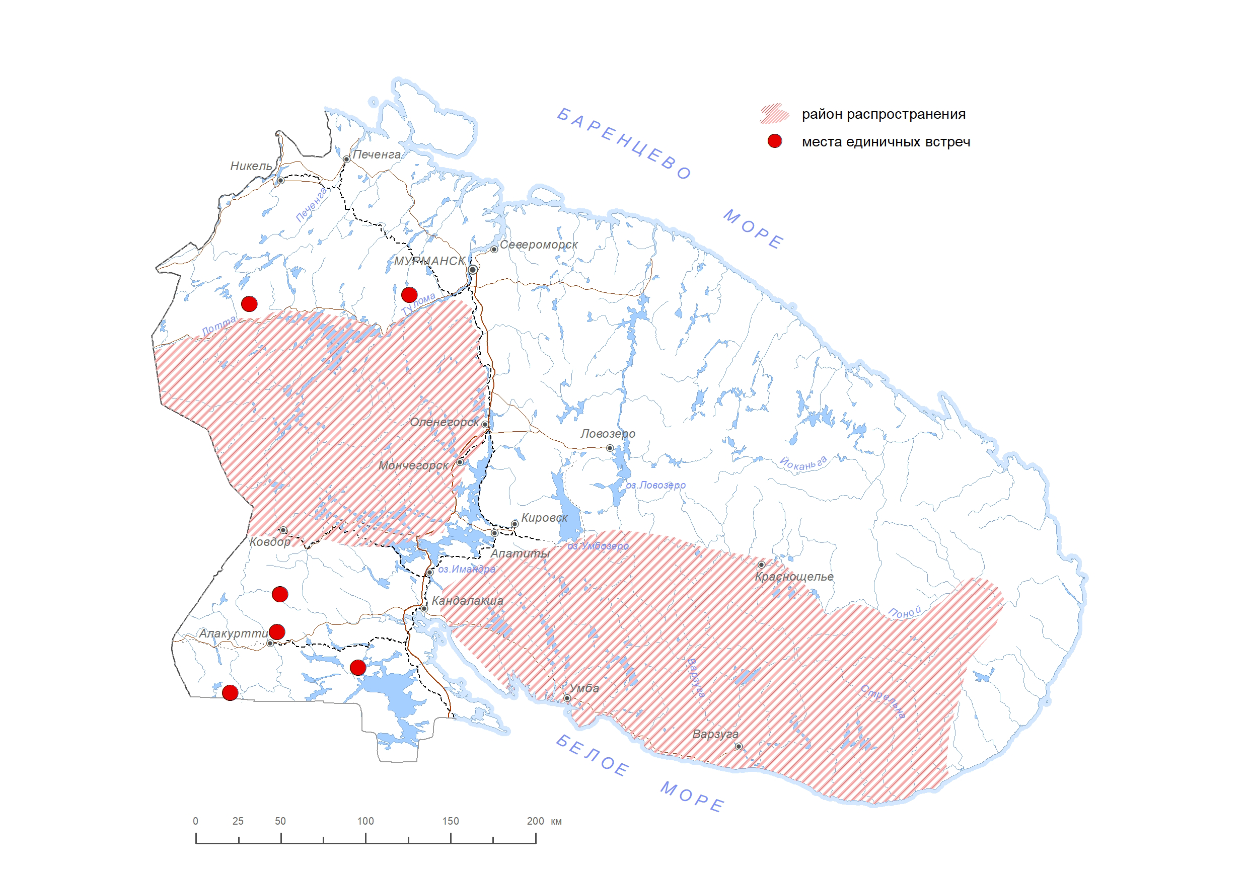 Точная численность неизвестна, так как за ревизионный период авиаучет проводился только в 2017 г. выборочно на востоке региона [5, 6]. Комбинированный учет оленя, включая авиаучет над территорией исторического ареала вида [2, 5 ,7], проведенный в 2013 г., показал отсутствие копытных к западу от Лапландского заповедника до приграничной территории, но в заповеднике было зафиксировано около 800 особей [7]. Западная и восточная популяции оленя в регионе разбиты на отдельные группы, и структура каждого стада нарушена [3, 6, 8]. Количество диких уменьшилось и ситуация как на западе, так и на востоке региона, не улучшается. В связи с этим и было решено включить обе формы дикого оленя в Красную книгу РФ [5]. Запрет на охоту на оленя в Ловозерском районе Мурманской обл. был введен на три года в 2017 г. [9], а полный запрет на охоту в области введен в 2020 г. [10].