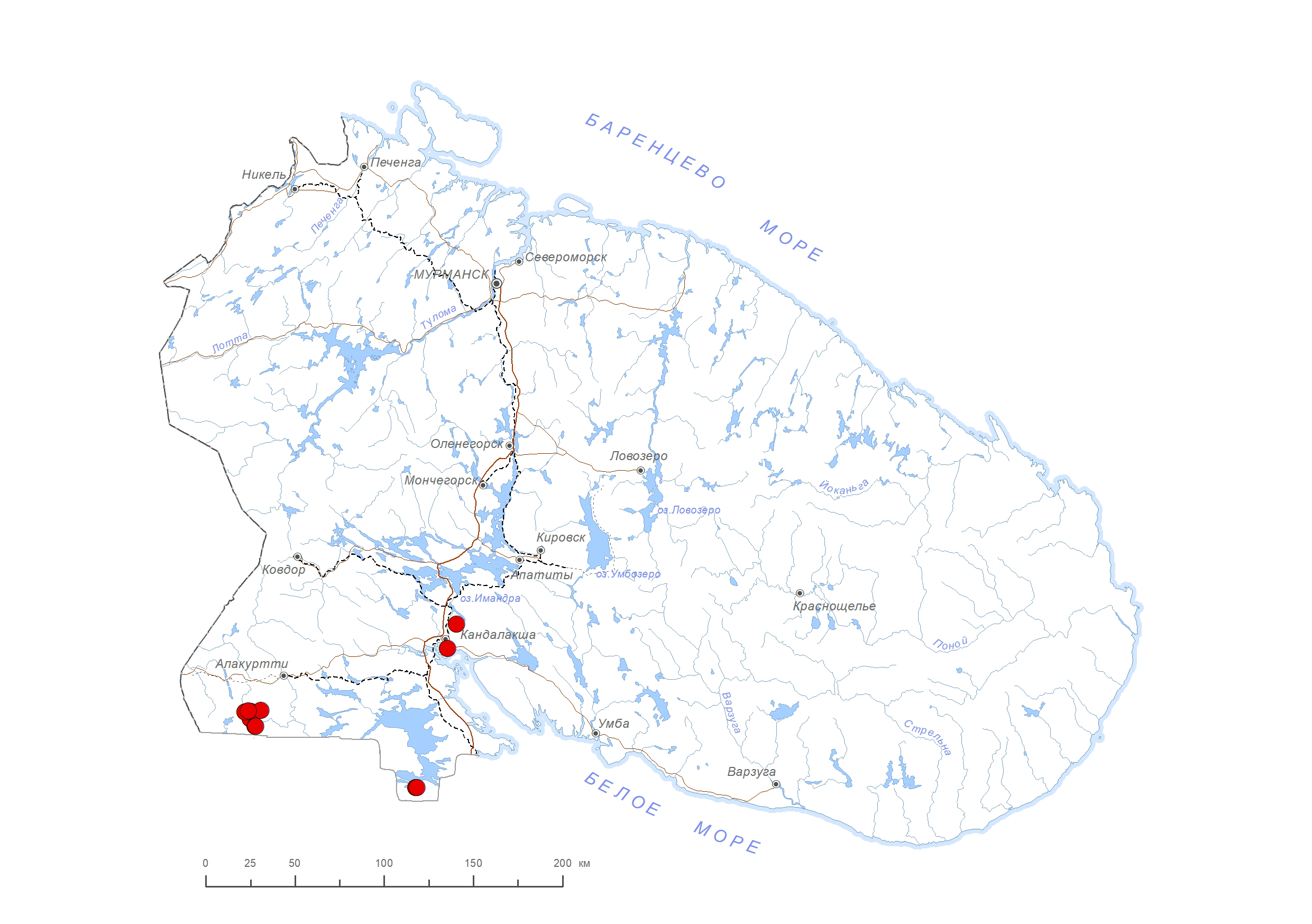 1. Данные Г.П. Урбанавичюса; 2. Ahlner, 1937; 3. Красная книга..., 2003; 4. Урбанавичюс и др., 2005; 5. Урбанавичюс, 2010.